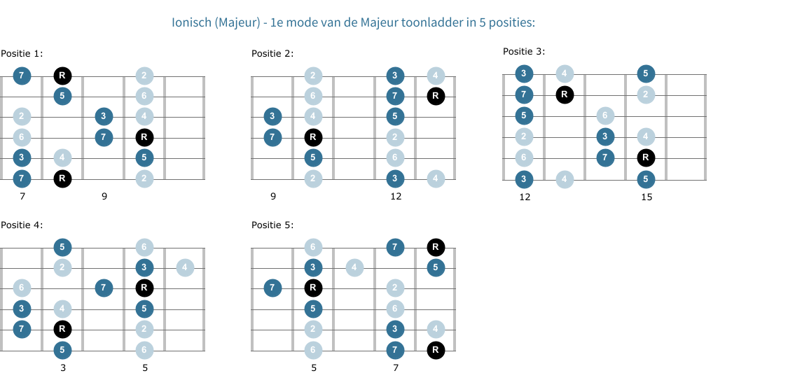 Modes van de majeur, harmonisch mineur en melodisch mineur toonladders